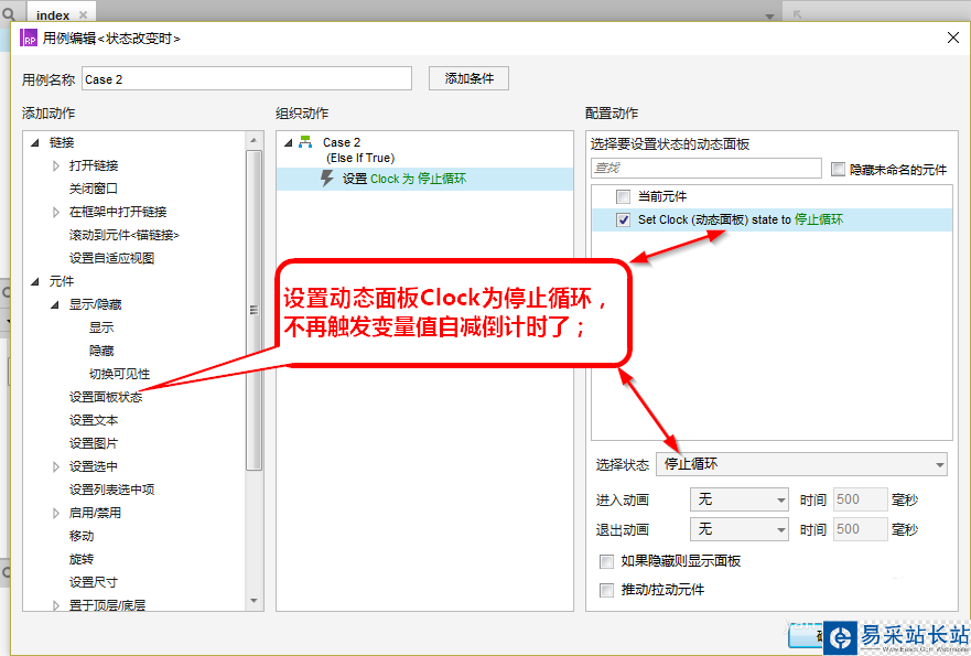 8、最后再設(shè)置一下當(dāng)Daojishi值自減到0時(shí)的情況,設(shè)置動態(tài)面板不再切換狀態(tài)了,即設(shè)置Clock為停止循環(huán);