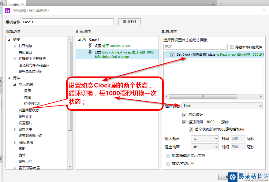 5、緊接著設(shè)置動態(tài)面板Clock中的狀態(tài)1、狀態(tài)2,循環(huán)著切換狀態(tài),1000毫秒切換一次;這舉是為了觸發(fā)動態(tài)面板的“面板狀態(tài)改變時(shí)”事件。