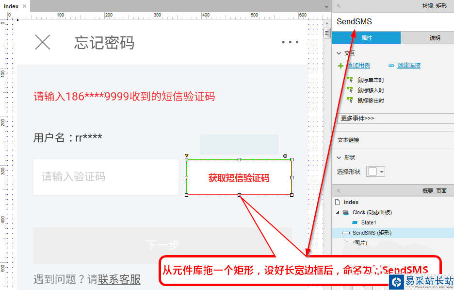 1、拖一個矩形,設(shè)置好長寬高,并命名為SendSMS;