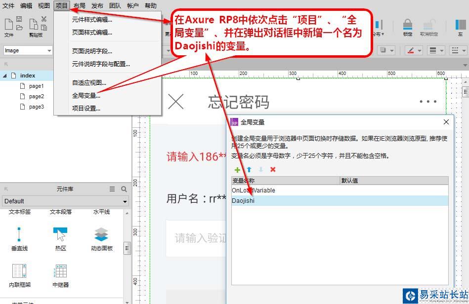 要實(shí)現(xiàn)倒計(jì)時(shí)的功能在AXURE中需要借助兩個元件配合才能完成,一個元件是“獲取短信驗(yàn)證碼”的按鈕;另一個元件是動態(tài)面板;同時(shí)還需要一個變量;變量在這里相當(dāng)于一個計(jì)時(shí)器,我們先把變量設(shè)置為60時(shí),一旦啟動了,就從60一直倒計(jì)時(shí)到0;