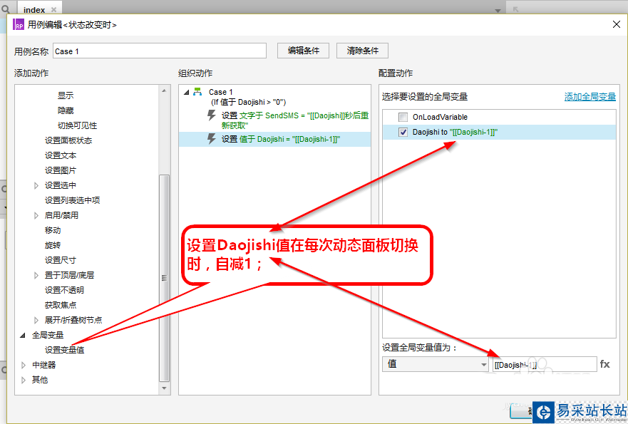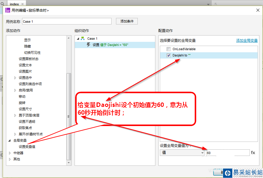 4、上述三步準(zhǔn)備工作做好后,咱開工設(shè)置吧;首先選中矩形框SendSMS,編輯用例“鼠標(biāo)單擊時(shí)”,給變量Daojishi設(shè)置一個初始值60,意為從60秒開始倒計(jì)時(shí);