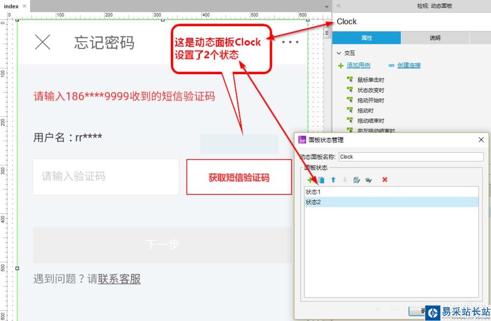 2、拖一個動態(tài)面板,隨便放一個位置都可以,(本例放在矩形框上方一點(diǎn)),將動態(tài)面板命名為Clock,并設(shè)置兩個狀態(tài),分別為狀態(tài)1、狀態(tài)2;