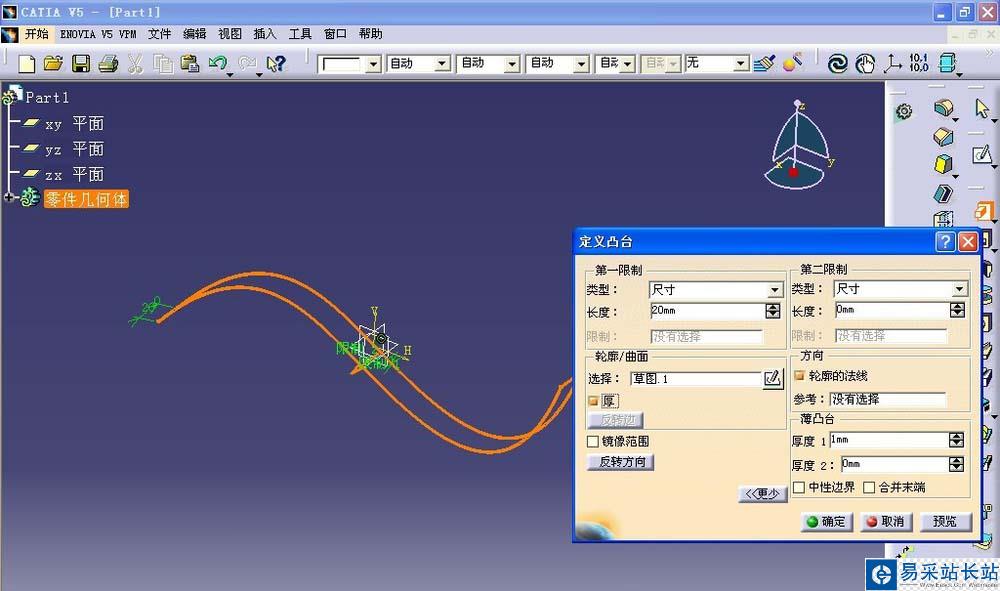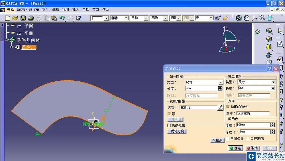 5、我們繼續調整參數,將薄凸臺欄中厚度 1設置為1,將第一限制長度設置為100,單擊預覽查看視圖,我們會發現通過定義凸臺命令中的"厚",參數可以對任意樣條線進行不同方向的拉伸,生成我們想要的實體。