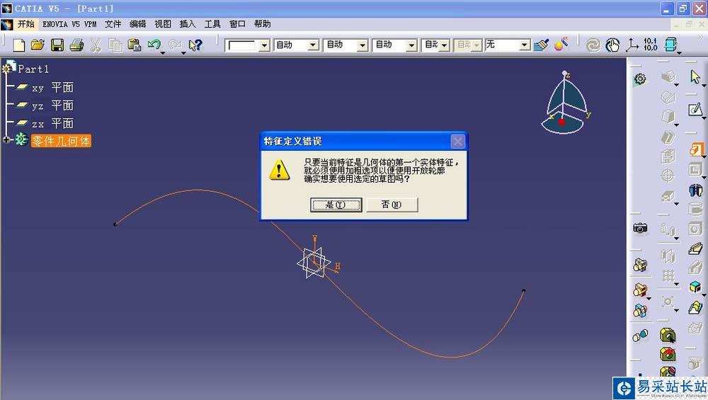 2、退出草圖界面,選擇剛創建的草圖,單擊凸臺命令,彈出特征定義錯誤對話框,這里我們單擊是<yes>;