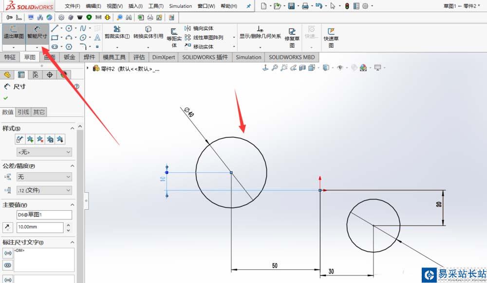 4、然后選擇智能尺寸將兩個圓進行完全定義,要讓兩個圓都變成黑色的線條,這樣之后圓就不會亂動了。
