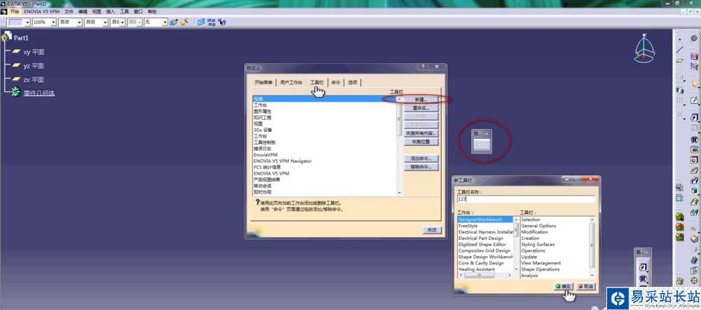 3、單擊工具欄,在列表中我們選擇新建一個(gè)新工具欄,名稱起為123,這時(shí)在視圖界面彈出一個(gè)空的工具欄;