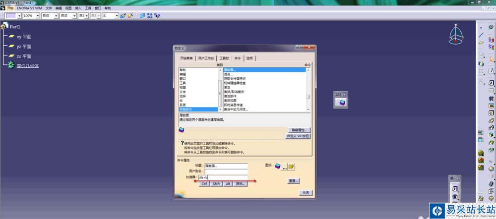 6、這是我們發(fā)現(xiàn)剛拖放進(jìn)去的厚曲面命令的加速器從灰色變成了白色,說(shuō)明現(xiàn)在可以設(shè)置快捷鍵了,如下圖所示,我們將厚曲面命令的快捷鍵設(shè)置為alt+b。