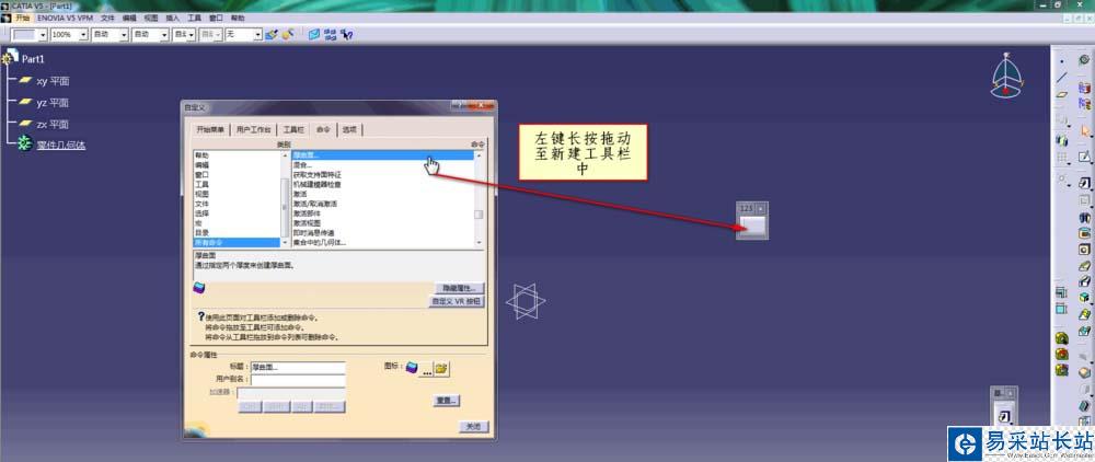 5、鼠標(biāo)左鍵長(zhǎng)按住厚曲面,將其拖放到剛才新建的工具欄中,如下圖所示;