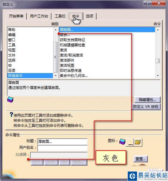 4、繼續(xù)在自定義對(duì)話框中選擇>命令,所有命令,選擇任意一個(gè)加速器顯示灰色的命令,例如:厚曲面;