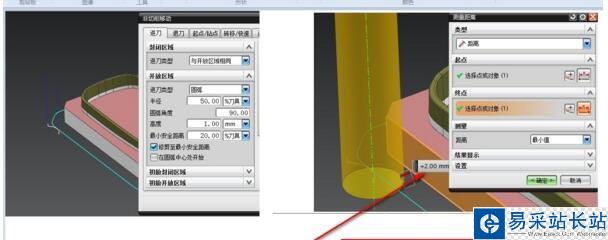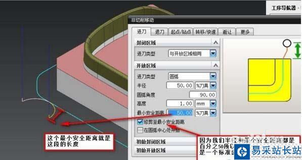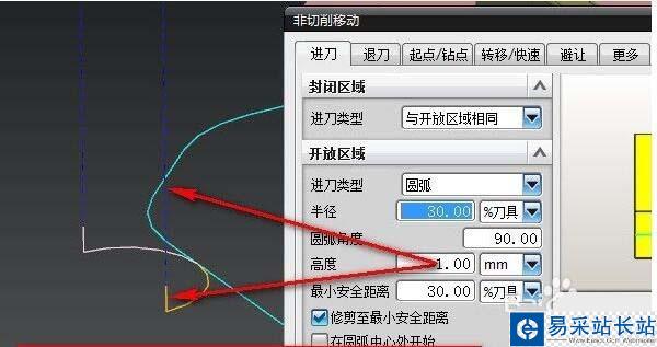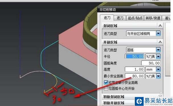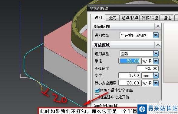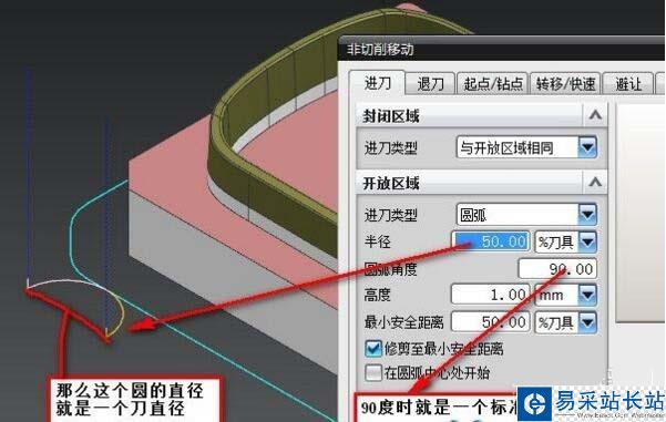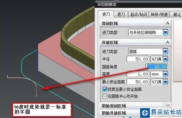 1、設置進刀類型為圓弧,半徑50%,圓弧角度90時即為一個標準的半圓。