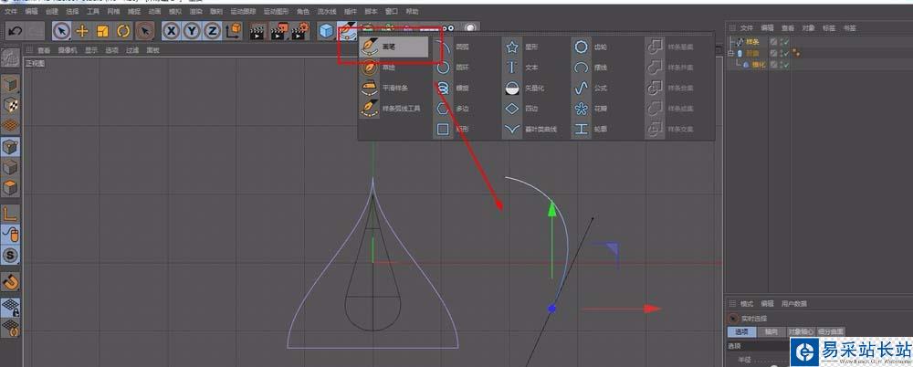 3、切換到正視圖,快捷鍵F4,使用畫筆,畫一條弧線,這條弧線,就是水滴的彎曲方式