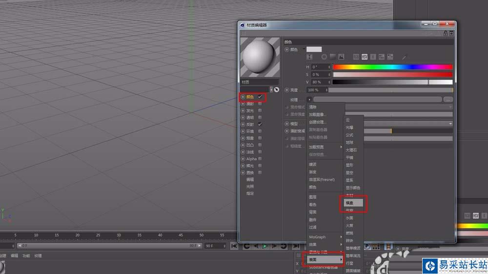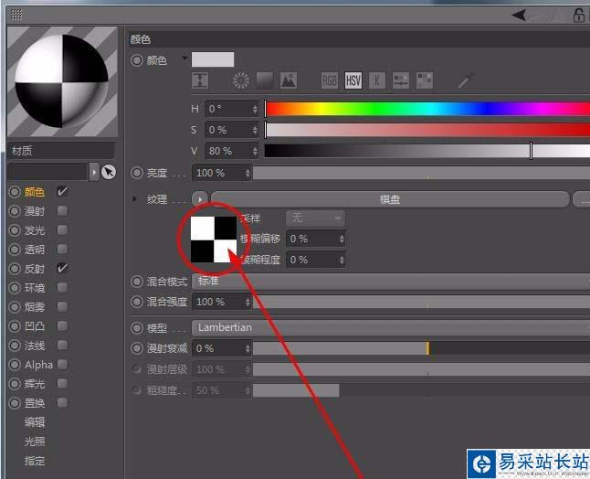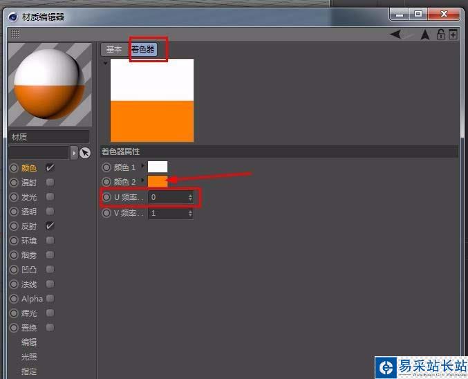 8、下面給水滴賦予圓環材質,新建一個材質球,如圖設置顏色-紋理選擇表面-棋盤,點擊棋盤采樣,選擇著色器,根據自己喜好選擇顏色,U頻率更改為0