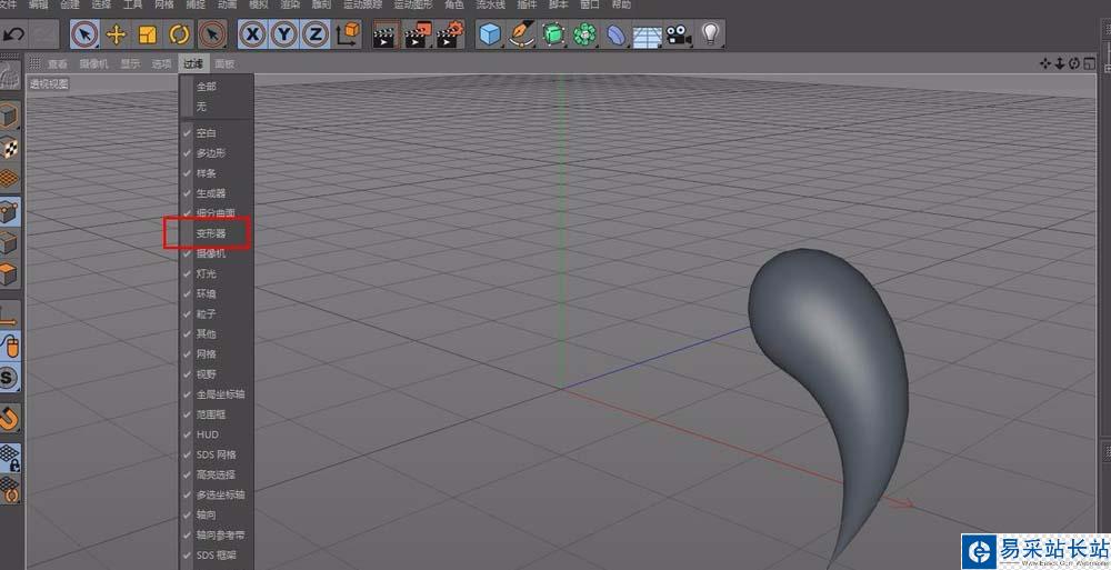 7、切換到透視視圖,按快捷鍵F1,可以看到水滴形狀已經出來了,如果不想顯示變形器的框,可以取消勾選,如圖