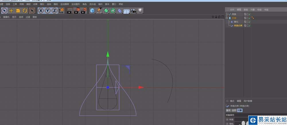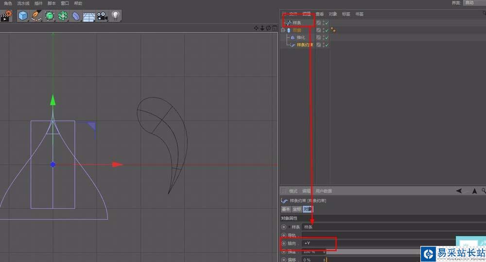 6、點擊樣條約束,如圖,拖動樣條到指定位置,軸向+Y,其他數值默認