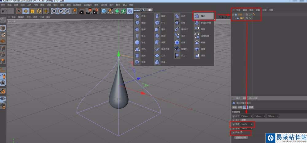 2、分析一下水滴的形狀,我們需要的一頭尖的,所以,給膠囊的這個物體,添加一個錐化,對象屬性如圖,強度100%,勾選圓角