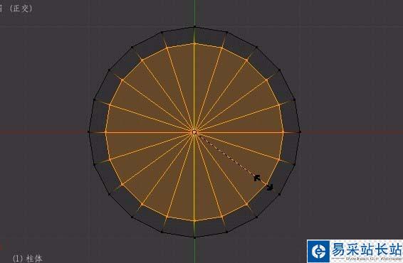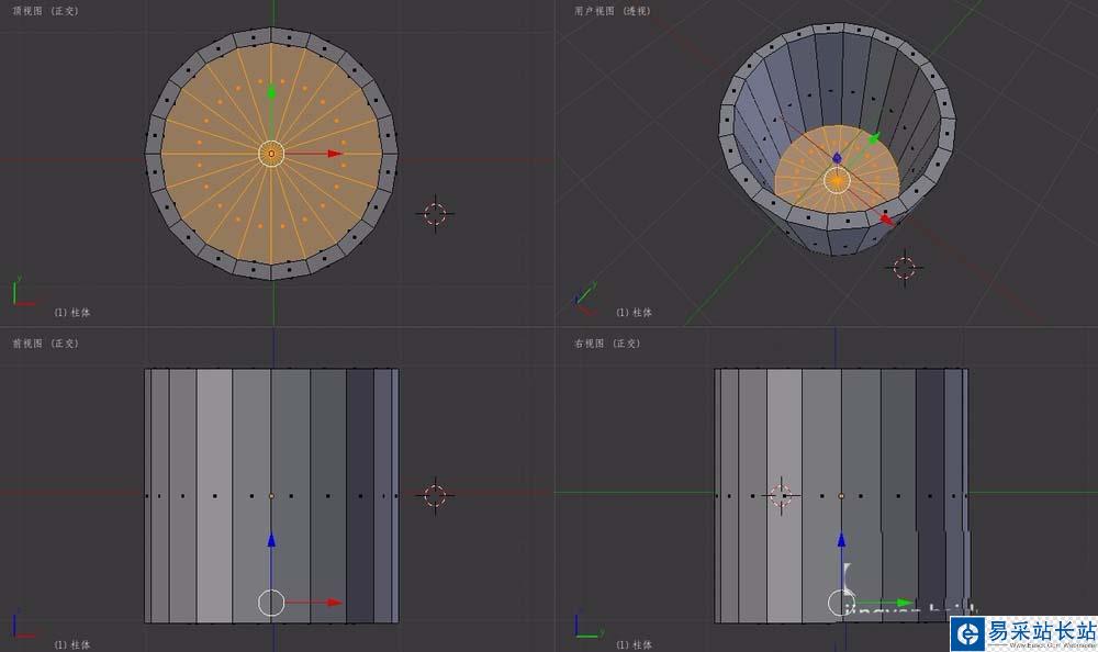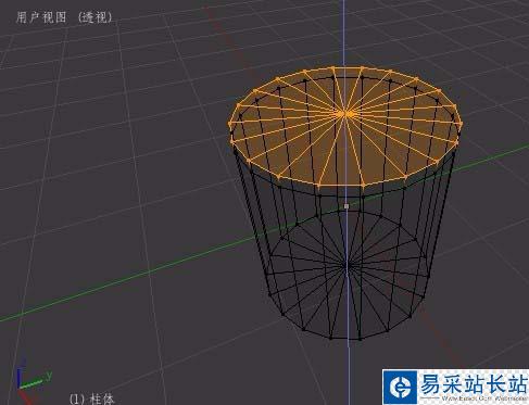 1、首先創建一個20面、三角片定邊的圓柱體,并且進入編輯模式、打開三視圖。