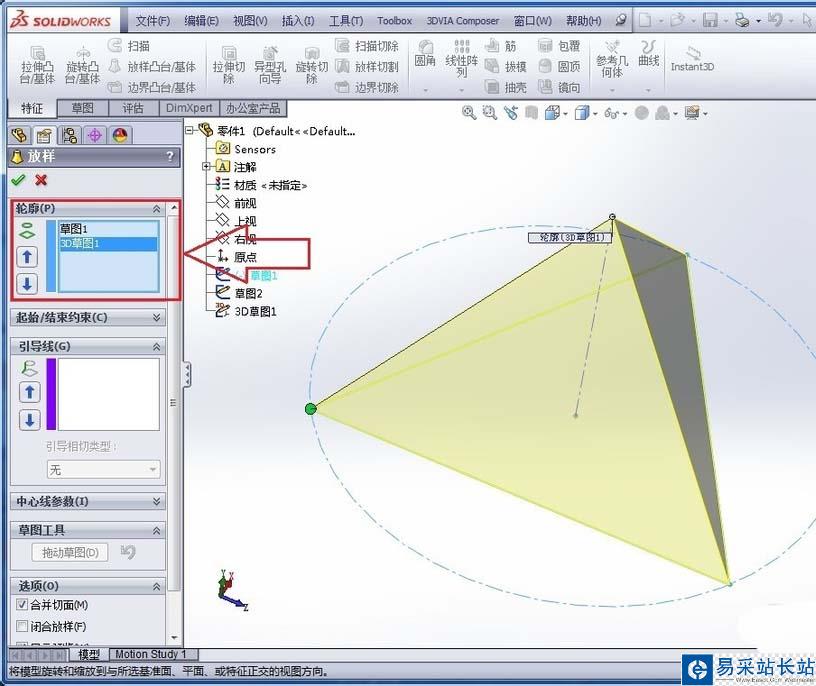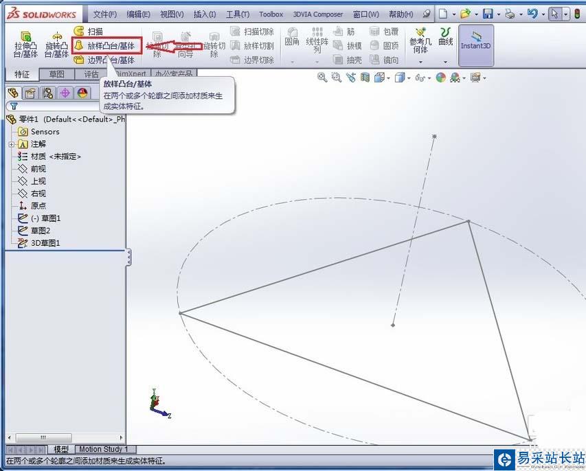 4、點擊“放樣凸臺”,在輪廓中選擇正三角形草圖和空間點草圖,然后點擊確定,如下圖所示: