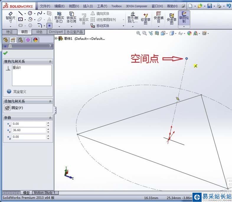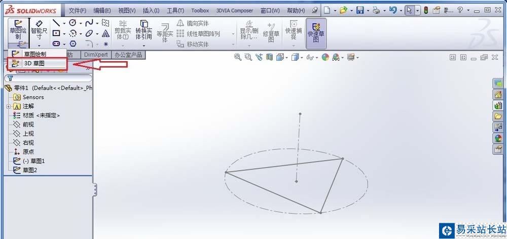 3、點擊“3D草圖”,在上一步所繪制的中心線的自由端端點繪制一個空間點,如下圖所示: