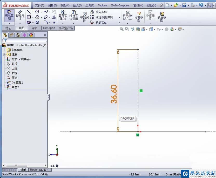 2、在垂直于正三角形草圖所在的基準面的基準面上由正三角形的中點開始繪制一條中心線,標注該中心線的尺寸,不用精確控制該尺寸,如下圖所示: