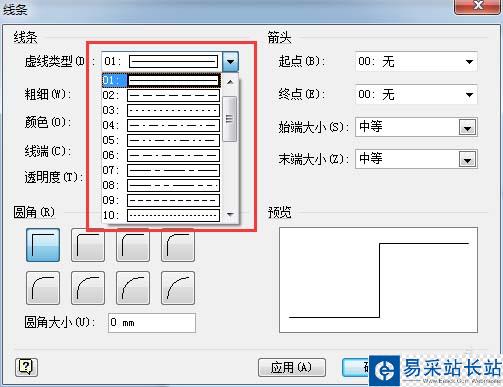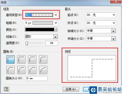 6、選擇好虛線類型后,在右下方的預覽里可以看到虛線的效果圖,如下圖所示。
