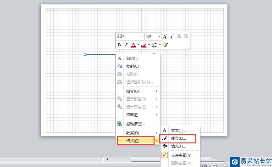 4、除了這種方法之外,還可以選定該直線,點擊鼠標右鍵彈出下拉菜單,在下拉菜單里選擇【格式】,在【格式】選項里找到【線條】選項,如下圖所示。