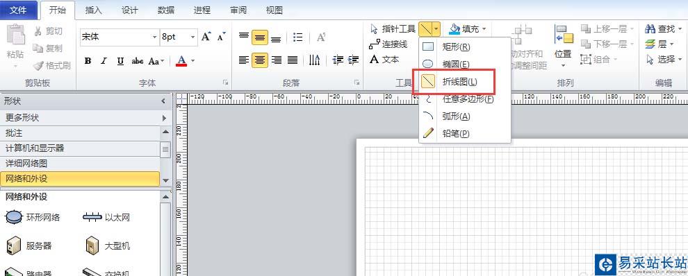 2、點擊正上方的【開始】菜單里的【指針工具】,選擇【折線】,首先在繪圖區(qū)域里繪制一根直線,如下圖所示。