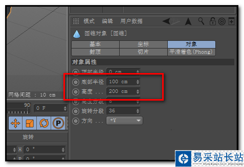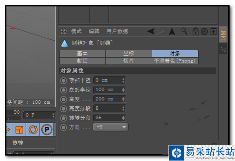 4、我們再看下屬性面板這里,顯示著圓錐的大小始終是底部100CM;高度200CM;同樣,要縮小的話,只要手指把鼠標滾輪滑向自己的方向即可。