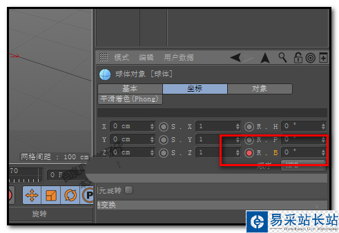 3、在屬性面板這里,點坐標;再點在R這里(旋轉)點下,如下圖所示,圓圈內呈紅色