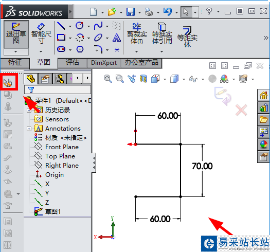 4、草圖繪制完成后,標注尺寸,點擊鈑金,如圖