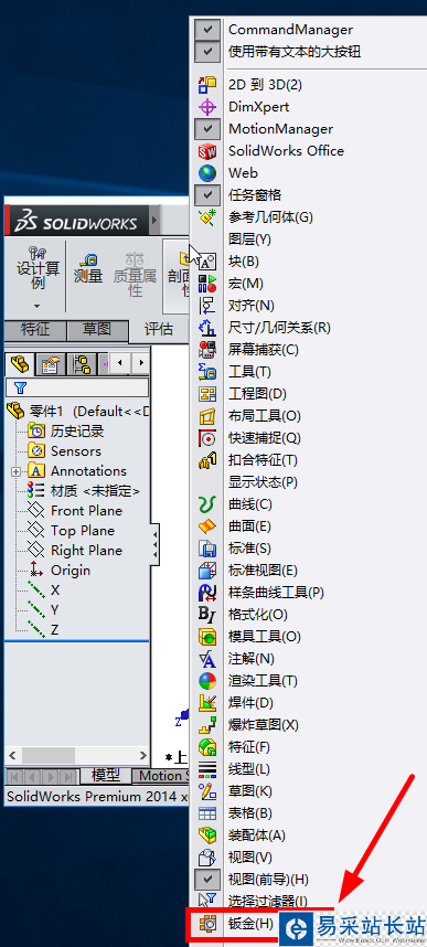 2、在工具欄上點擊右鍵,準備打開鈑金工具欄,