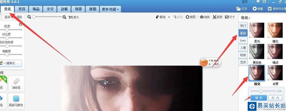7、接下來,在美化的菜單下面,選擇基礎的銳化,調整到40%。