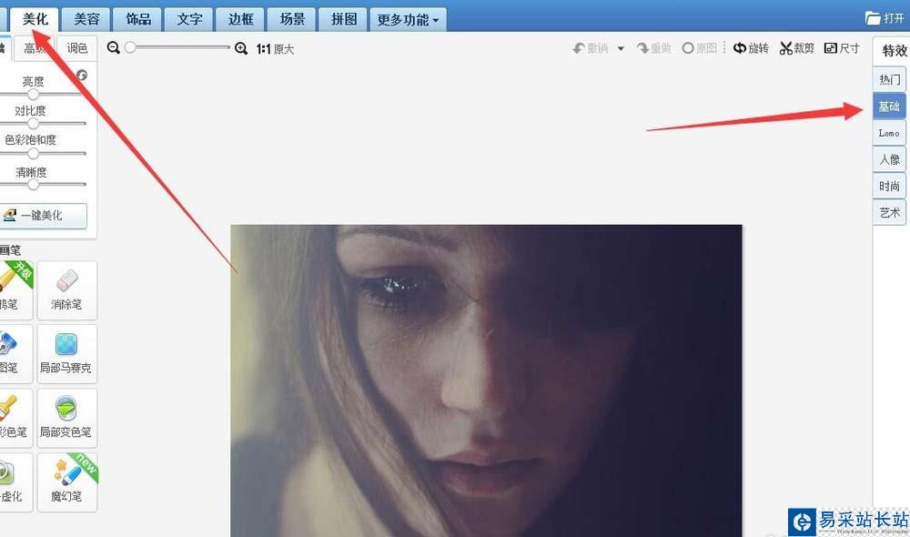 1、首先,打開美圖秀秀軟件,打開一張需要美化的圖片,點擊左側美化 ,接下來在右側點擊特效下面的基礎 選項。