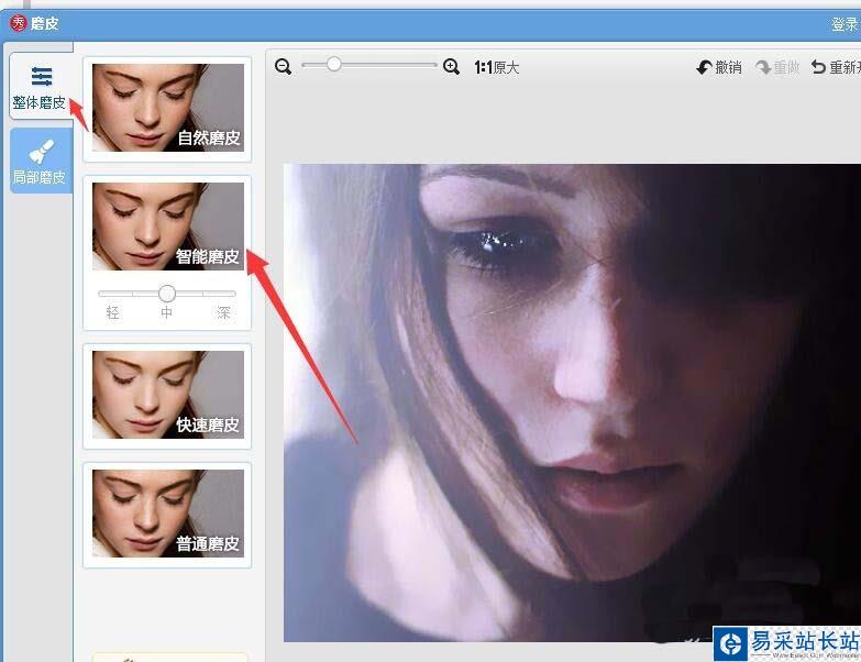 4、選擇整體磨皮下面的智能磨皮,還可以選擇局部磨皮,然后手動磨皮,之后點擊應用。
