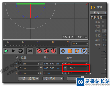 4、接著,我們目光定位在時間軸右下方這里,在旋轉(zhuǎn)這項中,再在”P“這里,輸入數(shù)字180