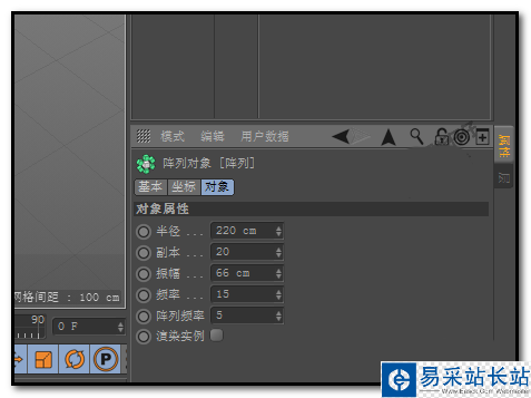 4、同時,也可以在“半徑”這里調節21個球體所圍成的圈的大小,半徑越大,所圍的圈就越大。現在這些球體都是規規矩矩的排列著;我們可以把這些球體排列給添加一定的“凌亂感”,設置“振幅”的參數;默認是0的。比如本例中的參考是66;“陣列頻率”參數也調下,本例設置為5