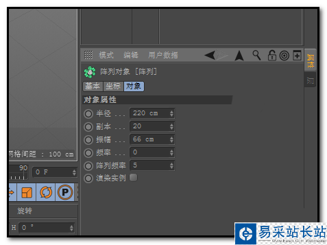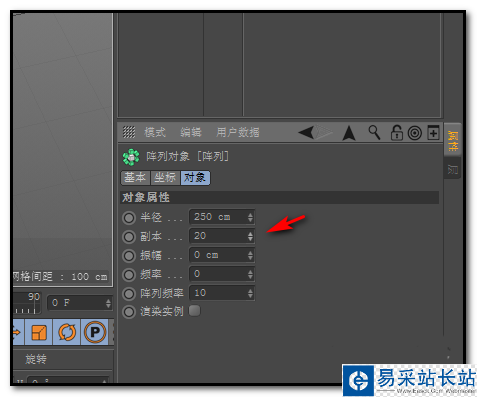 3、在屬性面板對象這里,可以設置副本數量,以增加小球的數量;比如,增加20個,那么,加上原來的這個,現在一共有21個球體了。