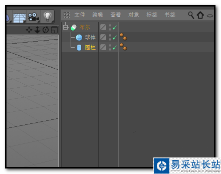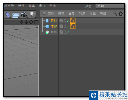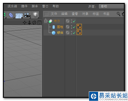 3、我們目光定位在操作界面的右上方這個(gè)面板;我們看到,從上而下排列:圓柱;球體;布爾,我們把“圓柱”和“球體”全選中。呈高亮狀態(tài);