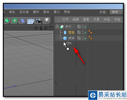 4、接著,鼠標(biāo)點(diǎn)住圓柱或球體,往“布爾”下方拖;這時(shí),你要留意下,有一個(gè)小箭頭,當(dāng)小箭頭呈向下方向時(shí),放開(kāi)鼠標(biāo),那么,布爾就成了父級(jí)了。