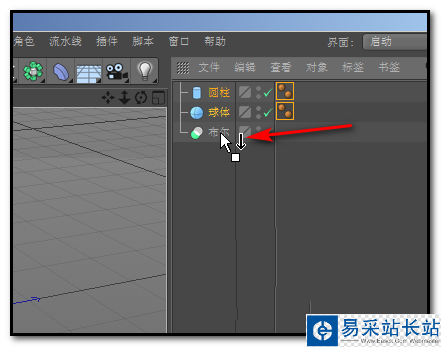 5、接著,鼠標(biāo)再點(diǎn)住“圓柱”拖到“球體”的下方;這時(shí),亦會(huì)出現(xiàn)小箭頭,你要等箭頭變成向左邊的時(shí)候才放開(kāi)鼠標(biāo)。