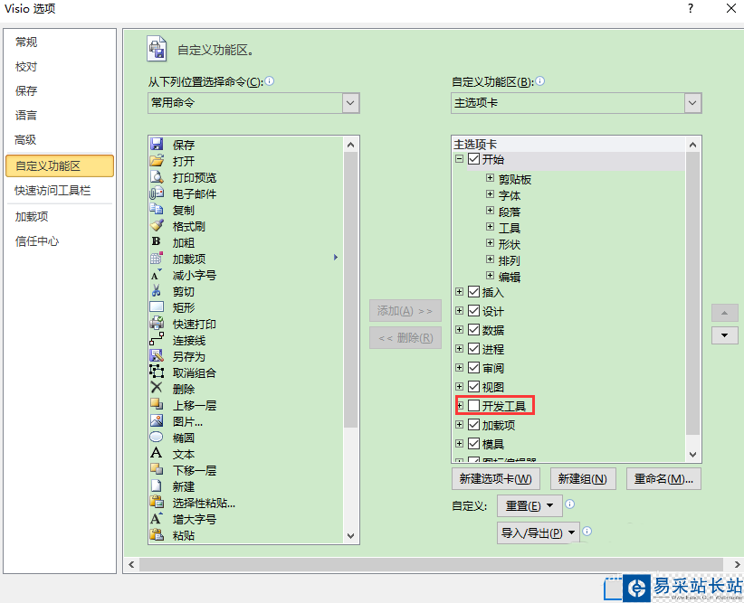 2、在選項(xiàng)對(duì)話框中,選擇自定義功能區(qū),勾上開(kāi)發(fā)工具