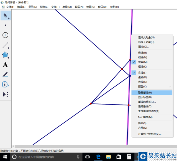 4、點擊其中一條垂線,點鼠標(biāo)右鍵,點擊隱藏垂線。接著把三條垂線都隱藏。