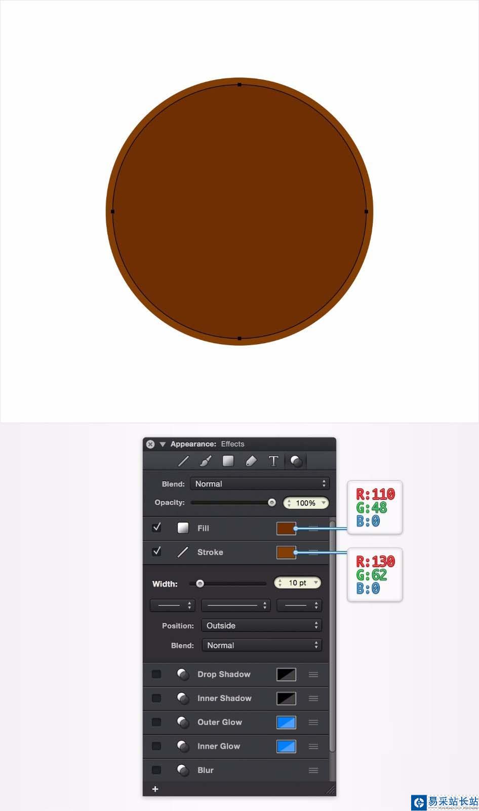 3/設置填充和筆觸樣式。選擇圓形后,切換到“ 外觀” 面板 中的“ 效果”窗格, 以自定義其筆觸和填充設置。點擊填充 項目的顏色 以更改圓圈的填充顏色。從RGB顏色選擇器中選擇 R:110 G:48 B:0。 點擊 中風 顏色,將筆畫顏色改為 R:130 G:62 B:0。接下來,單擊“筆畫”項目以查看和編輯筆畫設置。將行程寬度設置 為 10 pt ,將位置設置為“ 外部”。