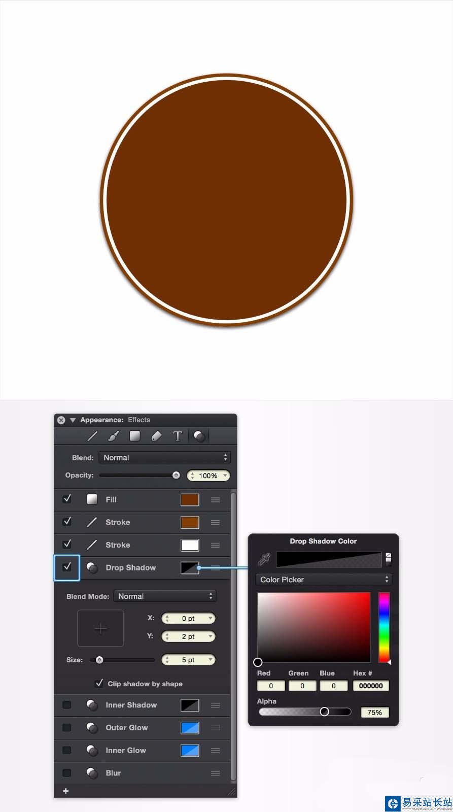 5、設置陰影。確保您的圓圈仍然被選中,繼續關注“ 外觀”窗格中的“效果”部分,只需檢查代表現有“ 陰影”效果的小框即可激活它。輸入0在X框和2在Ÿ箱,在5拖動大小滑塊,然后單擊代表這個顏色框陰影效果。確保顏色設置為黑色,并將Alpha滑塊以75%的速度拖動。