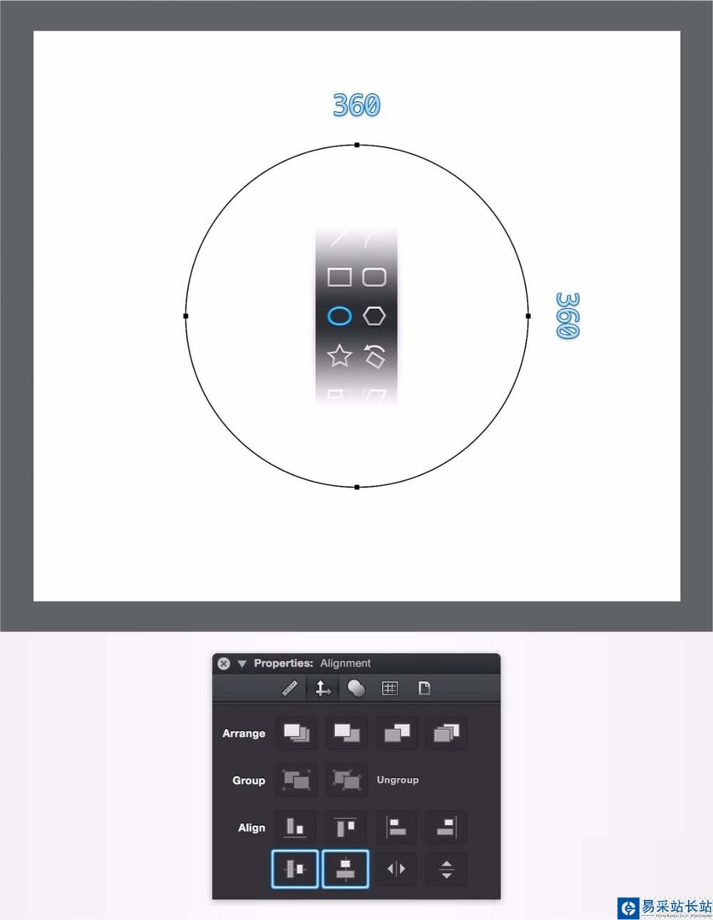 2、繪制橢圓。從工具欄中選擇 橢圓工具(O)。繪制寬度和高度為360像素的圓, 并確保它保持選中狀態并打開“ 屬性”窗格。專注于“ 對齊”部分,只需單擊“ 水平中心” 和“ 垂直中心” 按鈕即可將您的圓圈放在畫布的中央。