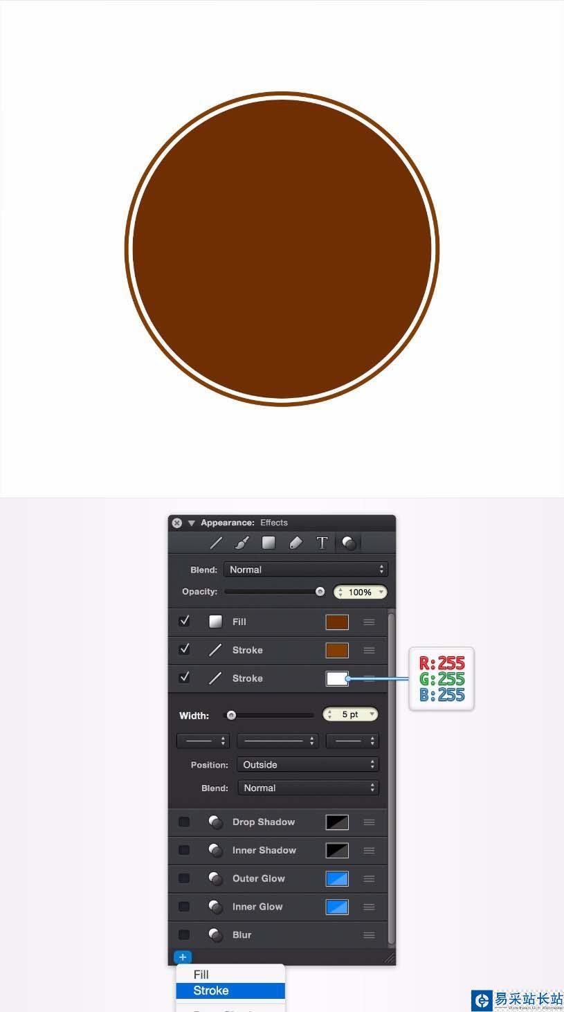 使用“ 效果” 窗格可以為形狀添加多個筆觸,填充和效果。單擊 面板底部的 “+”按鈕, 從彈出菜單中選擇 “筆畫”,將第二個筆劃添加到圓形。將第二個筆畫的寬度設置為 5 pt,其顏色為白色(R:255 G:255 B:255),并將其位置設置設置為 Outside。