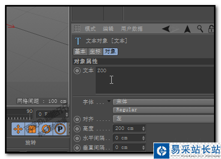 2、場(chǎng)景中現(xiàn)出“文本”兩字。我們?cè)谖淖謱傩悦姘暹@里把“文本”刪除,輸入我們目標(biāo)文字;比如,ZOO