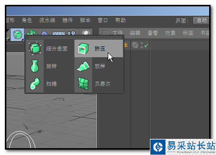 3、在對(duì)象面板這里,鼠標(biāo)點(diǎn)下文本;左手再按住ALT鍵;鼠標(biāo)點(diǎn)開“細(xì)分曲面”的圖標(biāo),彈出的面板中點(diǎn):擠壓;