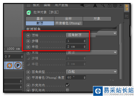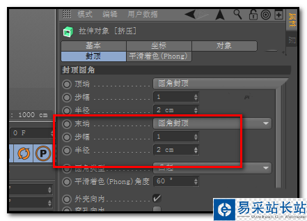 7、在“頂端”這里點(diǎn)下“封頂”,彈出菜單中點(diǎn):圓角封頂,這時(shí),即顯出“圓角封頂”的設(shè)置選項(xiàng)。