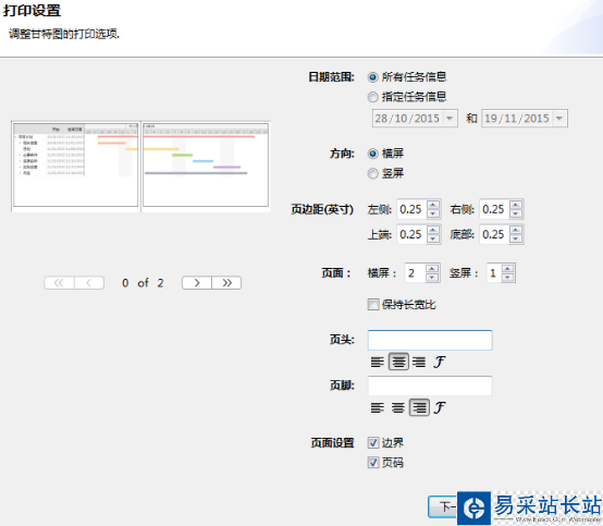 2、打開甘特圖視圖之后,我們可以在視圖菜單中找到“打印”選項。點擊后出現打印設置窗口,我們可以在其中選擇打印的任務信息包括日期的范圍,調整方向、頁邊距,并且結合多頁打印功能我們也可以將甘特圖打印成多塊的版面。