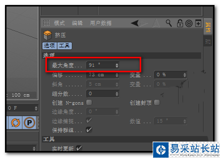 7、當(dāng)我們把角度調(diào)整為91度時(shí),場(chǎng)景中的擠壓出來的兩個(gè)立方體隨即連在一起了??梢钥吹剑@個(gè)與角度有關(guān)。我們把角度修改為90時(shí),兩個(gè)立方體又分開了,那么,我們知道,若想把擠壓出來的立方體給連在一起角度要大于90度。